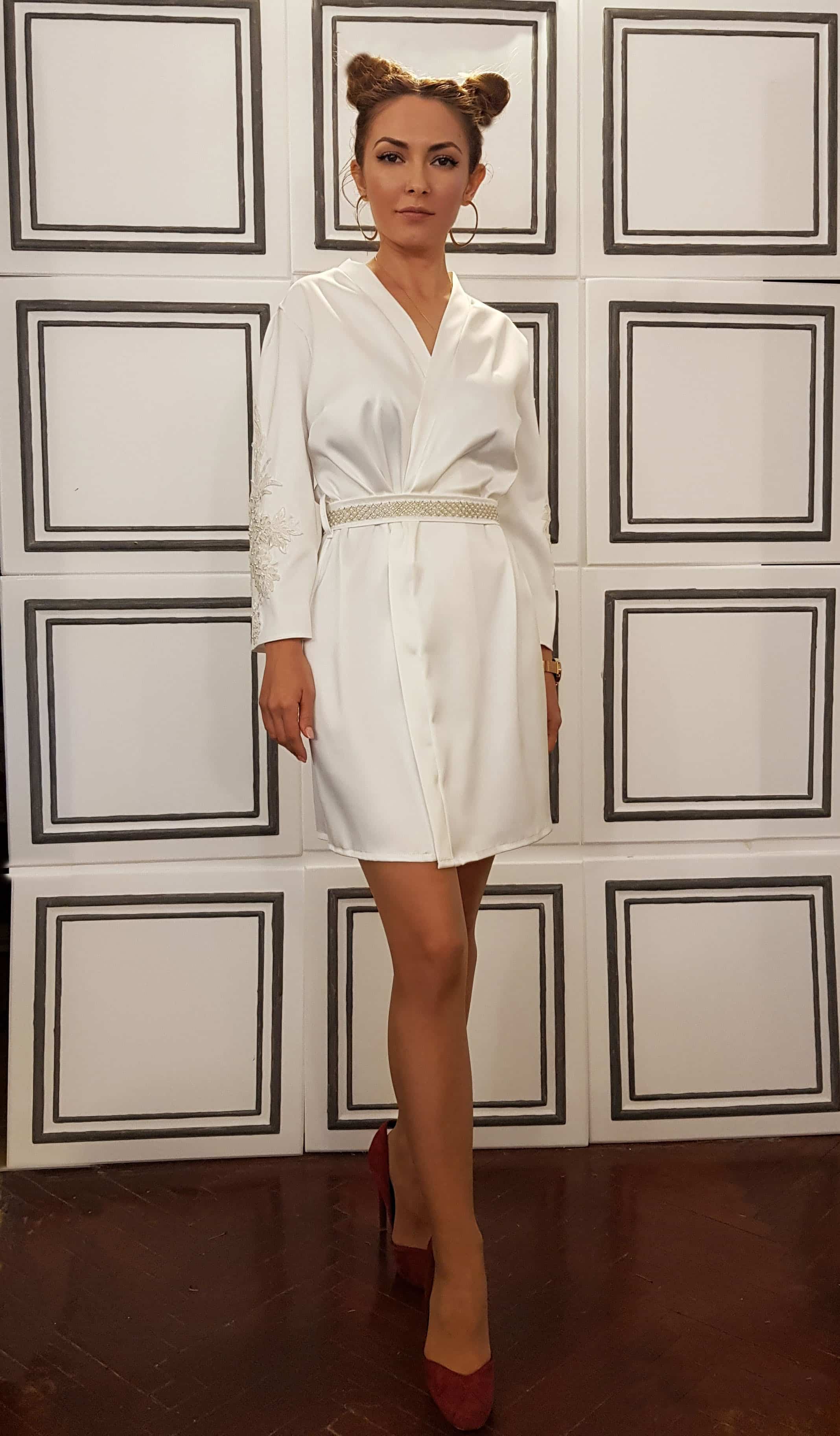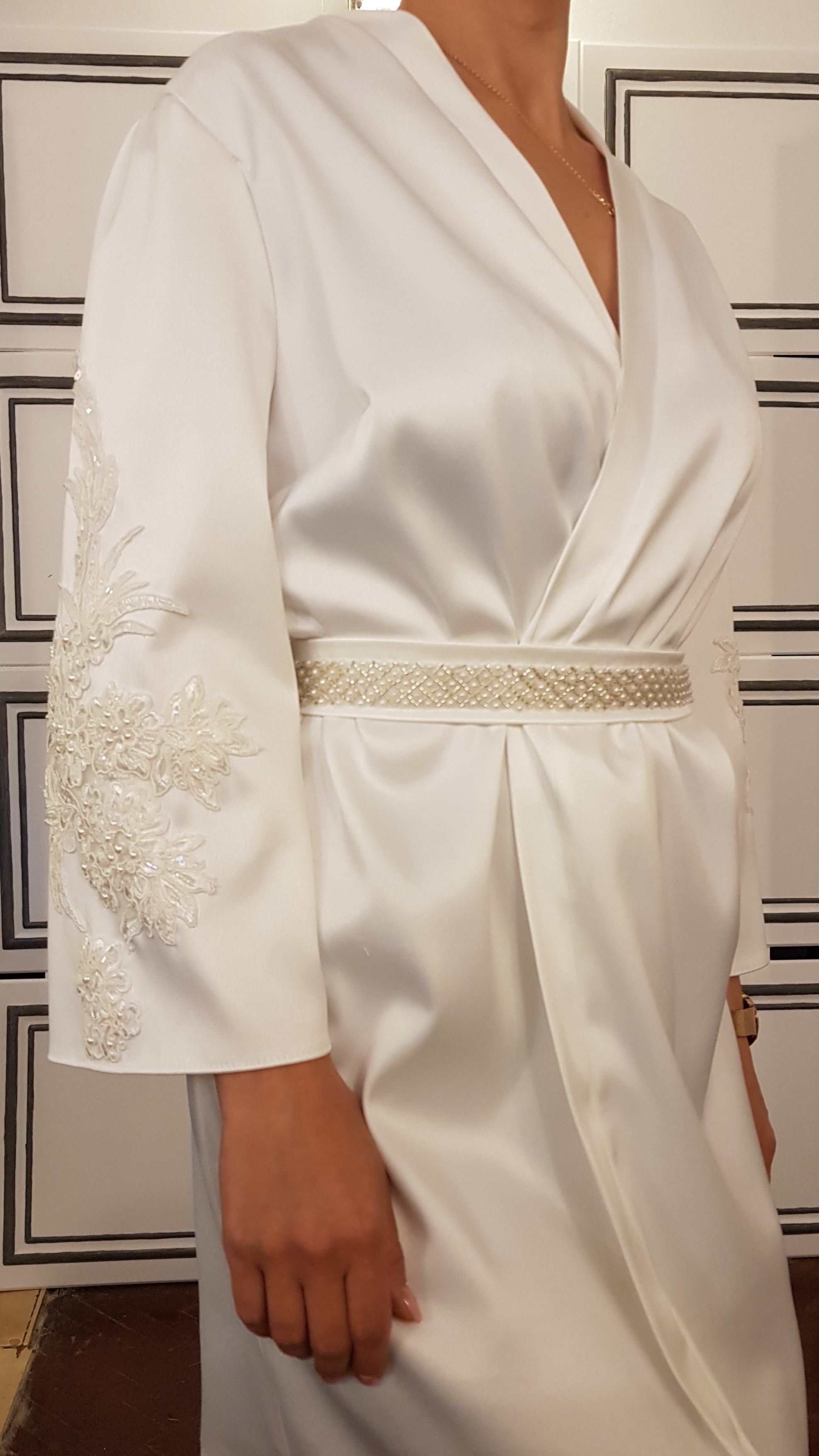 Halatul Lace Premium se realizeaza pe comanda, in functie de dimensiunile fiecarei mirese. Are manecile trei sferturi si usor evazare. Dantela brodata ce infrumuseteaza aspectul manecilor este cusuta manual. Talia este accentuata de un cordon cu perle si margele mici.