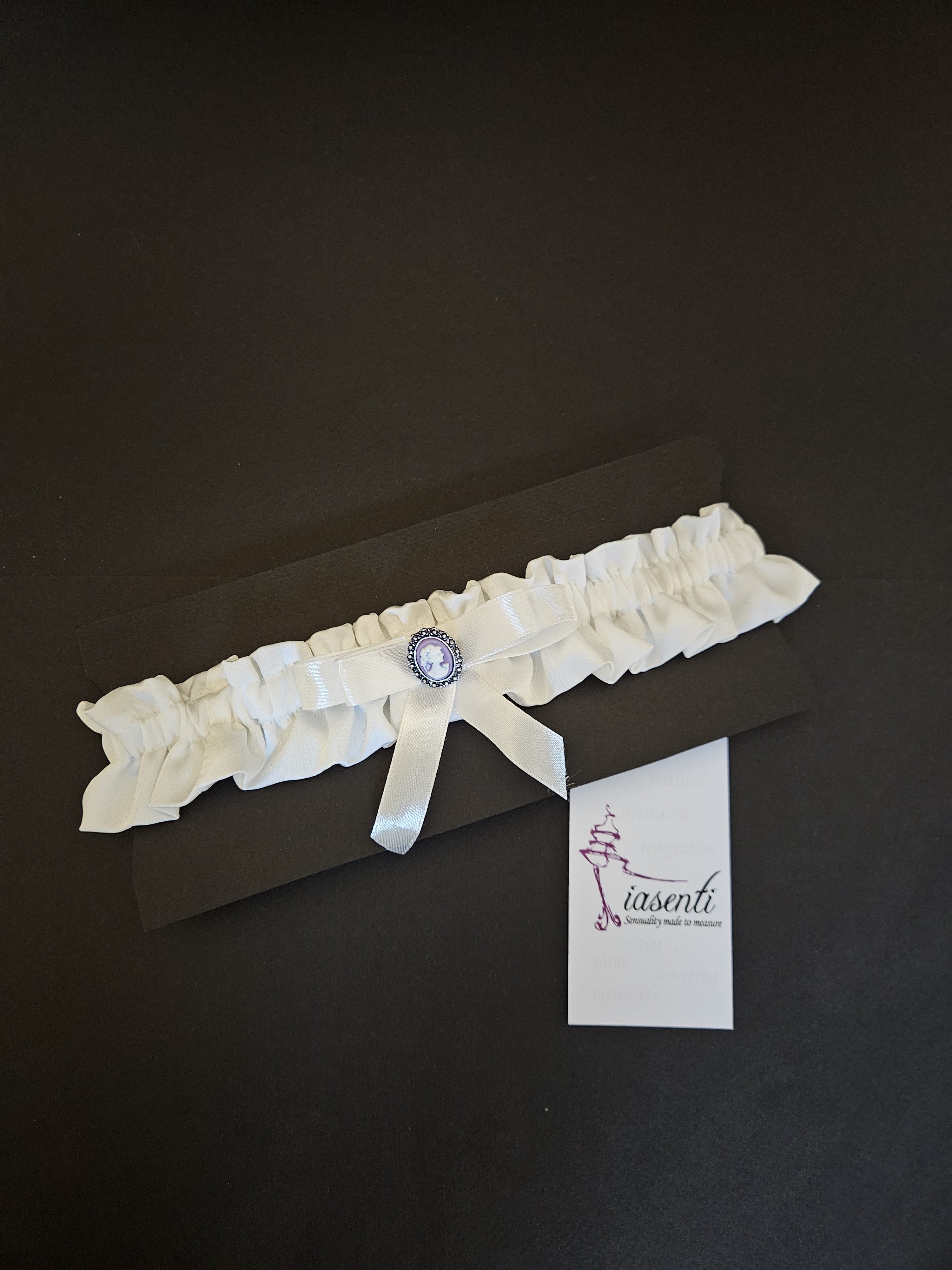 Jartiera Hera Camee face parte din cea mai noua colectie de accesorii de lux pentru mirese by Iasenti. Noi propunem modele unice, lucrate in mare parte manual, cu materiale fine și elemente prețioase. Aceasta jartiera pe elastic are latimea de 4 cm. Funda alba satinata este accesorizata cu o mica brosa camee (culoarea brosei poate fi diferita de cea din imaginea prezentata).