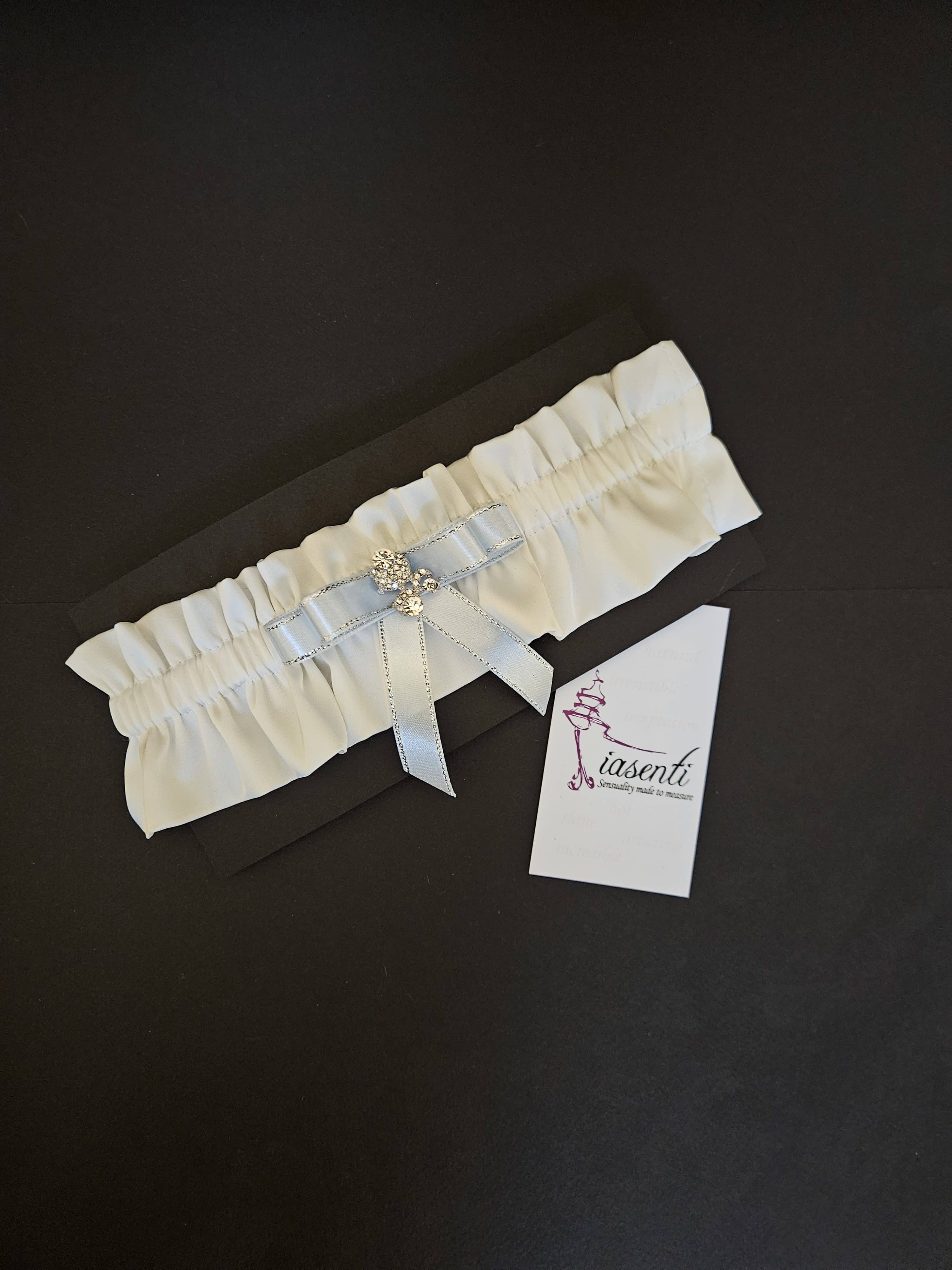 Jartiera Kira Bleu face parte din cea mai noua colectie de accesorii de lux pentru mirese by Iasenti. Noi propunem modele unice, lucrate in mare parte manual, cu materiale fine și elemente prețioase. Aceasta jartiera pe elastic are latimea de 6 cm. Funda bleu marcata de un fir argintiu este accesorizata cu o mica bijuterie.